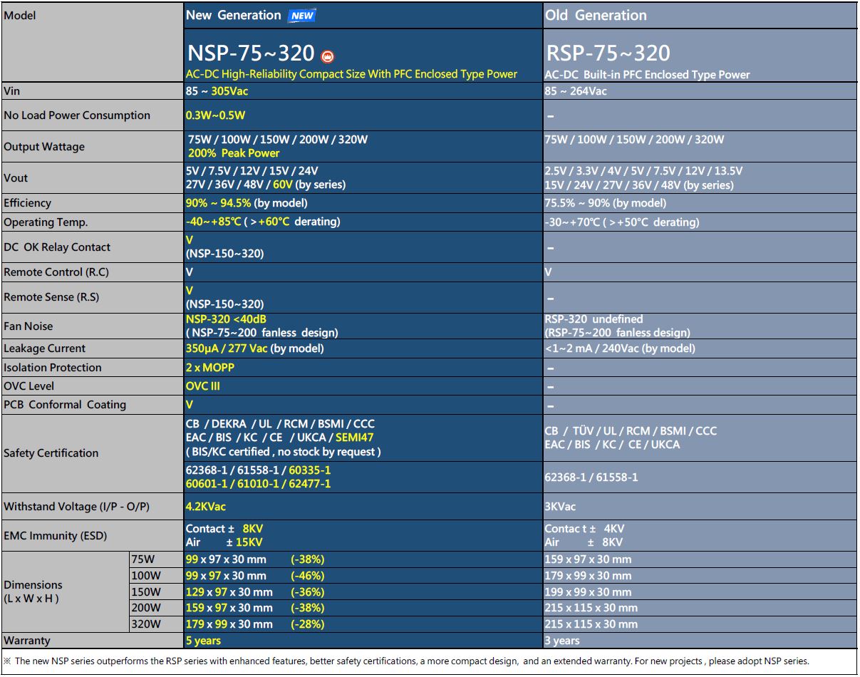 The all-new NSP series fully surpasses the RSP series with a higher cost-performance ratio: Its dimensions are significantly reduced, and the operating temperature range is expanded to -40~+85℃, with full load operation possible up to +60℃, making it suitable for harsher environments. At the same time, it has obtained safety certifications in multiple industries, including ICT, industrial, medical, household, and green energy applications, ensuring durability and reliability. The NSP series is the true next-generation replacement for the RSP series, offering competitive pricing, extended warranty, and improved cost reduction and efficiency, making it the ideal choice for almost every new design.