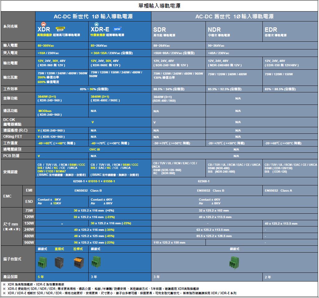 XDR-E 系列:75W~960W 全新世代 1Ø 輸入超薄性價兼備導軌電源