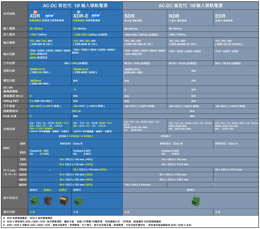 相較於已上市超過10年的舊世代 SDR / NDR / EDR 三大家族,全新XDR/XDR-E家族尺寸更小型化、機型更完整、規格更優、安規認證更齊全、保固期延長….等,皆顯著優於舊世代產品 (新舊世代差異詳如下表)。全新世代 XDR / XDR-E 系列可直接取代舊世代產品,客戶可依不同規格與應用場景,靈活選擇高階旗艦款 XDR 或性價兼備款 XDR-E,實現兼具高效與最佳成本之電源方案,同步提升整體系統競爭力 !